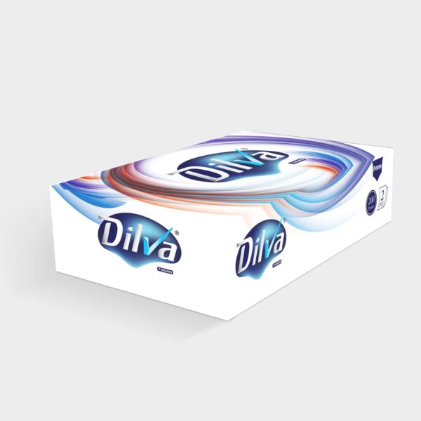 - التصميم: أزرق × أبيض بعلامة "Dilva Tissues"