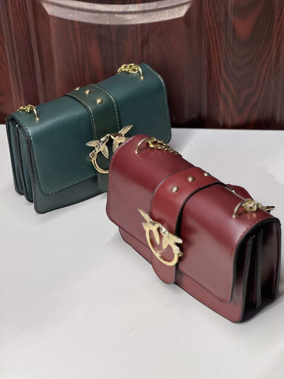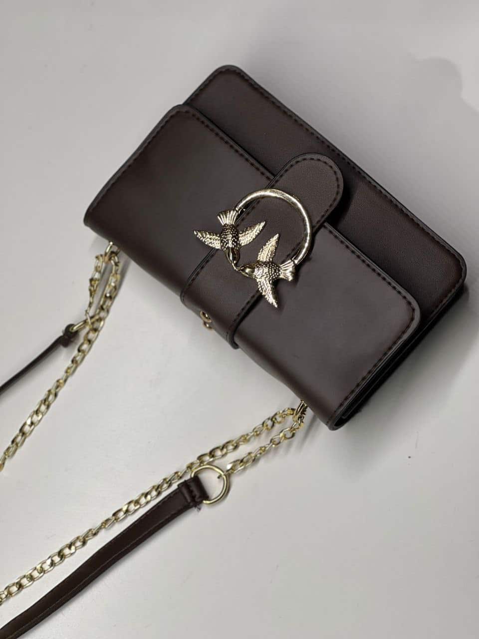 شنطة جلد فاخرة بسلسلة معدنية وتصميم طيور ذهبي – لمسة أناقة لا تقاوم