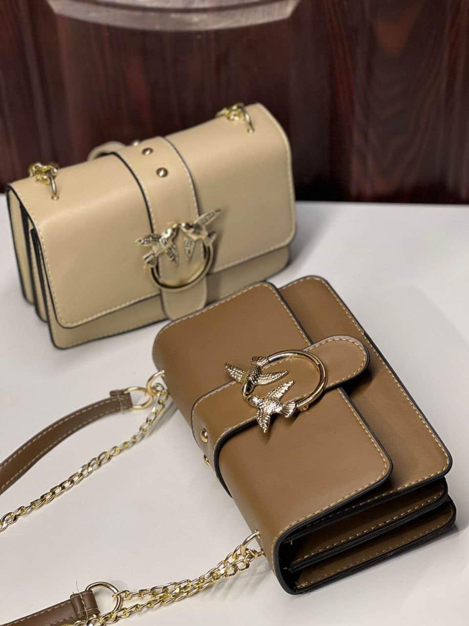 تتميز بتفصيلة أمامية أنيقة بشكل طيور ذهبية تضيف سحر فريد للشنطة، مع سلسلة معدنية ذهبية تضاعف فخامتها.