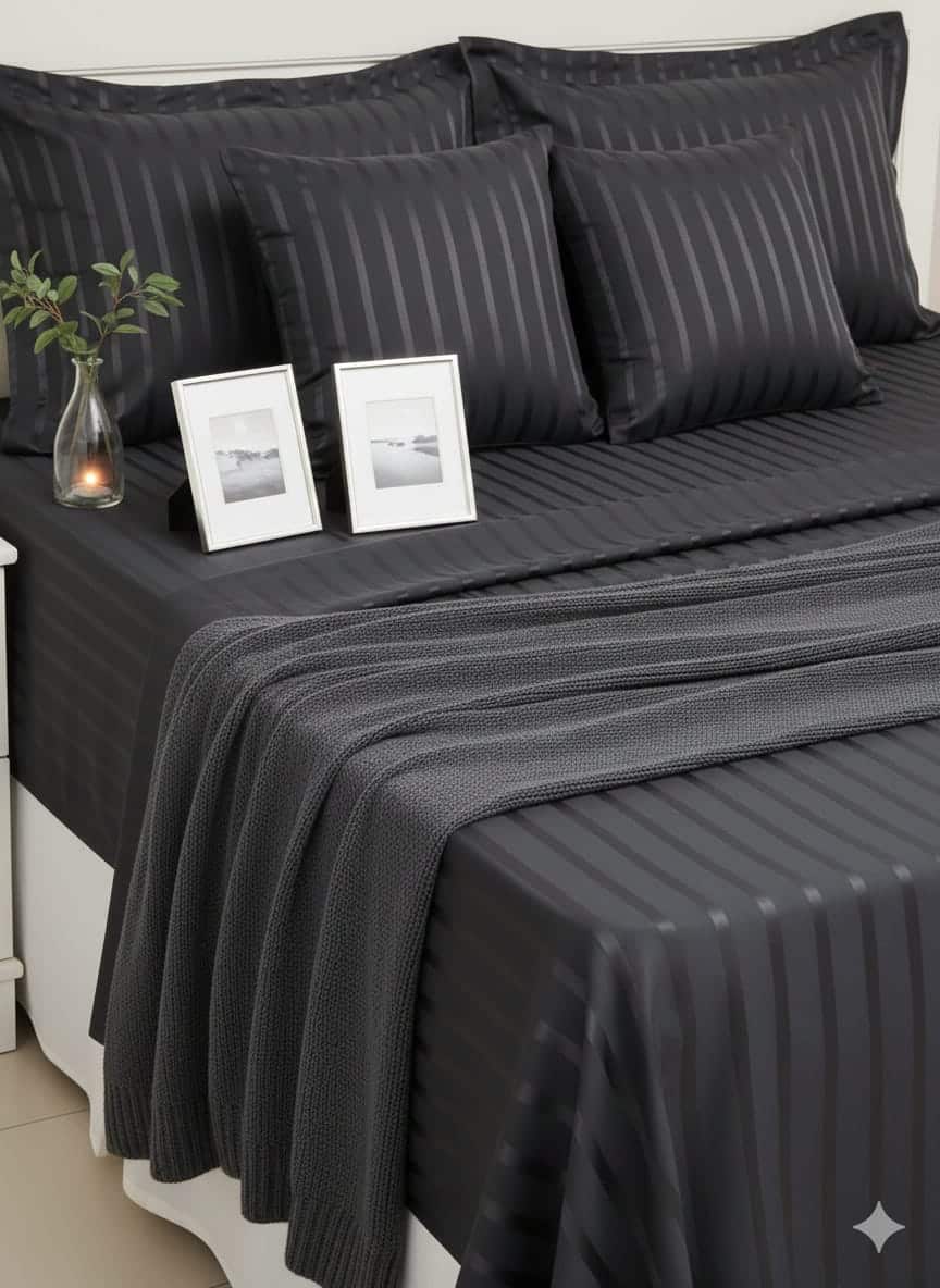 يأتي طقم ملاية استرايب اسود 4 قطع بتصميم عصري أنيق يناسب مختلف ديكورات غرف النوم، مع خامة عملية مريحة للاستخدام اليومي. نقشة الاسترايب (الخطوط) تمنح السرير مظهرًا مرتبًا وجذابًا، مما يجعله من المنتجات المطلوبة في محلات المفروشات.