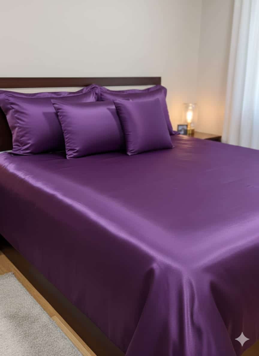 يتميز طقم ملاية ستان تركي موف 4 قطع بمظهر أنيق ولمسة ناعمة تضيف فخامة لغرف النوم. خامة الستان تمنح السرير شكلًا راقيًا وبراقًا، لذلك يعد من المنتجات المميزة والمطلوبة في محلات المفروشات والبيع بالجملة.