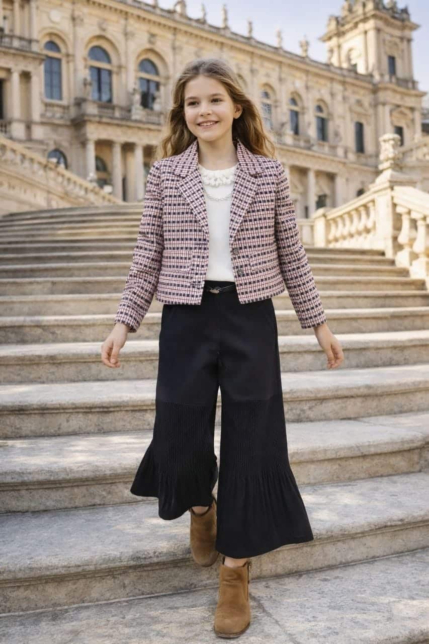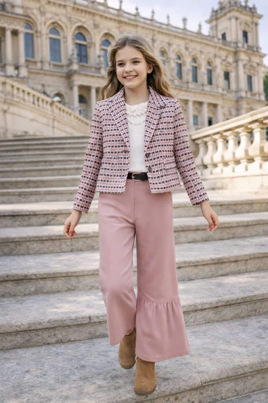 البنطال: تصميم وايد ليج (Wide Leg) عصري من خامة الجبردين الفاخرة، التي تضمن مظهراً راقياً وتحملاً كبيراً لحركة الأطفال.