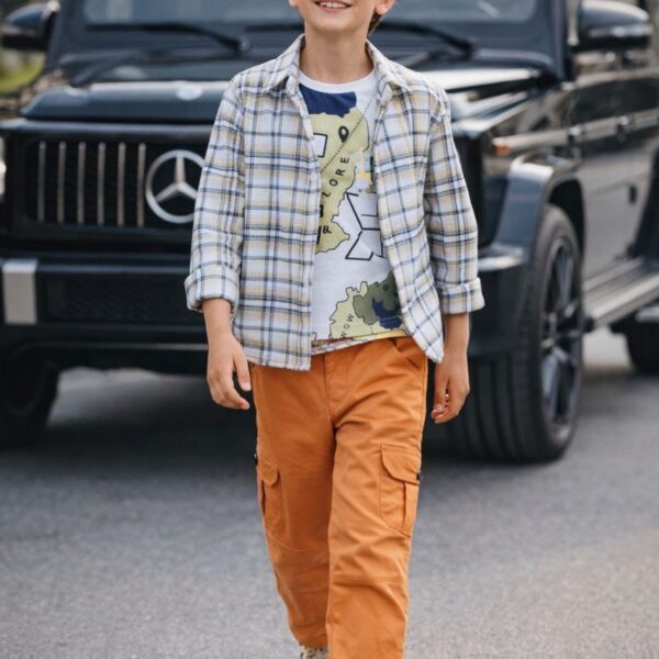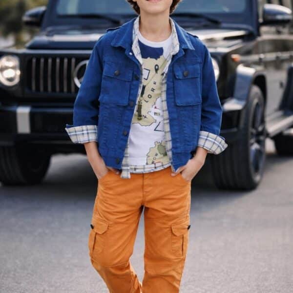 بنطال مارينز: تصميم عسكري بجيوب جانبية، خامة متينة جداً تتحمل حركة الأطفال، مع تقفيل خياطة احترافي.