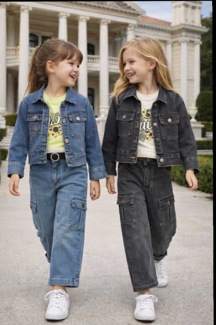 للمحلات المتخصصة في ملابس الأطفال، نقدم لكم الطقم العملي والأكثر طلباً للأعمار الصغيرة. تصميم يجمع بين متانة الجبردين ومرونة الليكرا ليمنح طفلتك حرية الحركة الكاملة مع إطلالة عصرية "مظبوطة".