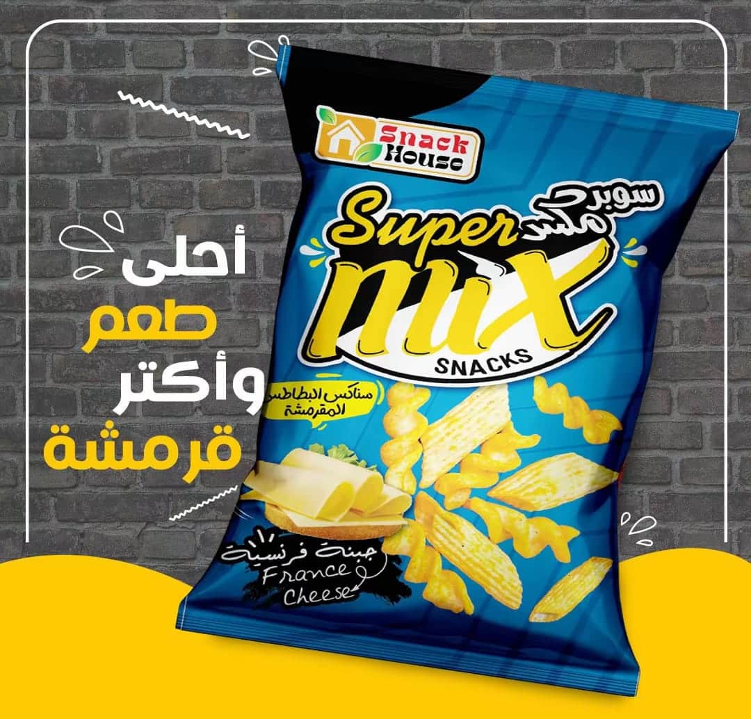 سوبر مكس سناكس مقرمش محبوب عند الأطفال، بنكهات مختلفة تناسب كل الأذواق. منتج سريع الحركة في السوبر ماركت والبقالات ويعتبر من السناكس المطلوبة باستمرار.