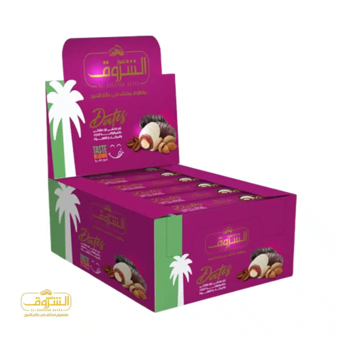 12× باكت 12عبوه 3تمرات -تمر محشي 3نكهات ولوز ومغطي شيكولاتة (قهوه-شيكولاتة بيضاء-شيكولاتة غامقة)