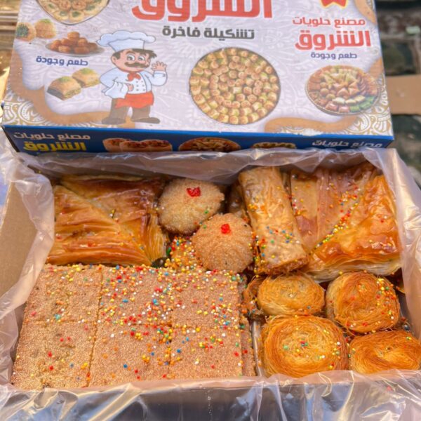 المحتوى: تشكيلة متنوعة من الحلويات الشرقية (بسبوسة، كنافة عش البلبل، جلاش، وحلويات مزينة بالفارماسيل).