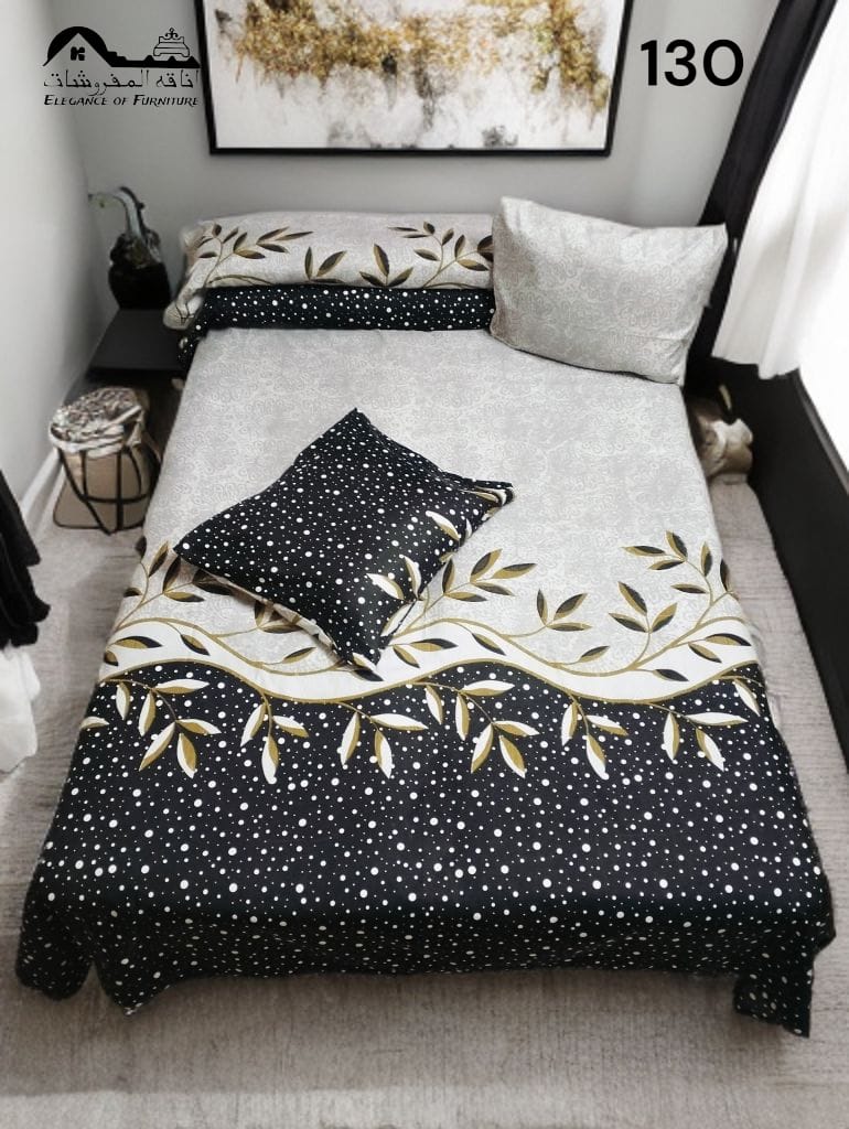 ملايات قطن كود 130 أسود في أبيض – 100 طقم بتصميم أسود على أبيض، خامة ناعمة ومريحة، مناسبة لغرف النوم العصرية والمودرن، متوفرة بجميع المقاسات.